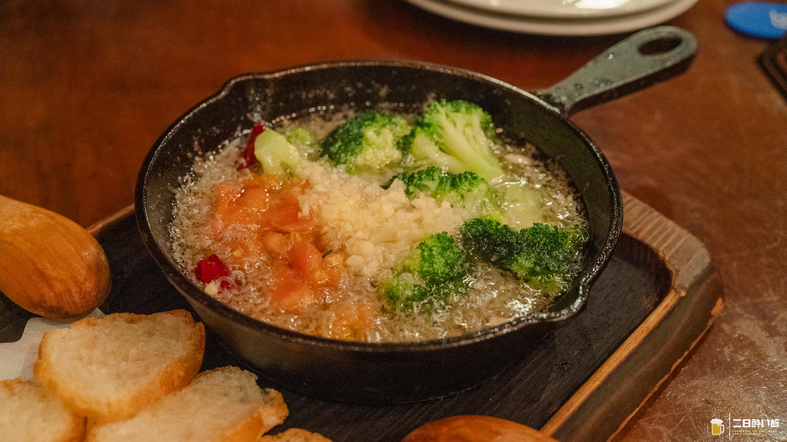 最初のニンニク料理はアヒージョ!。もうテーブルに置かれた瞬間からにんにくの香りがもわっと!うー!食欲をそそる!具材はしらすとブロッコリーとトマトかな?薄切りバゲッドに乗せてぱくり。
