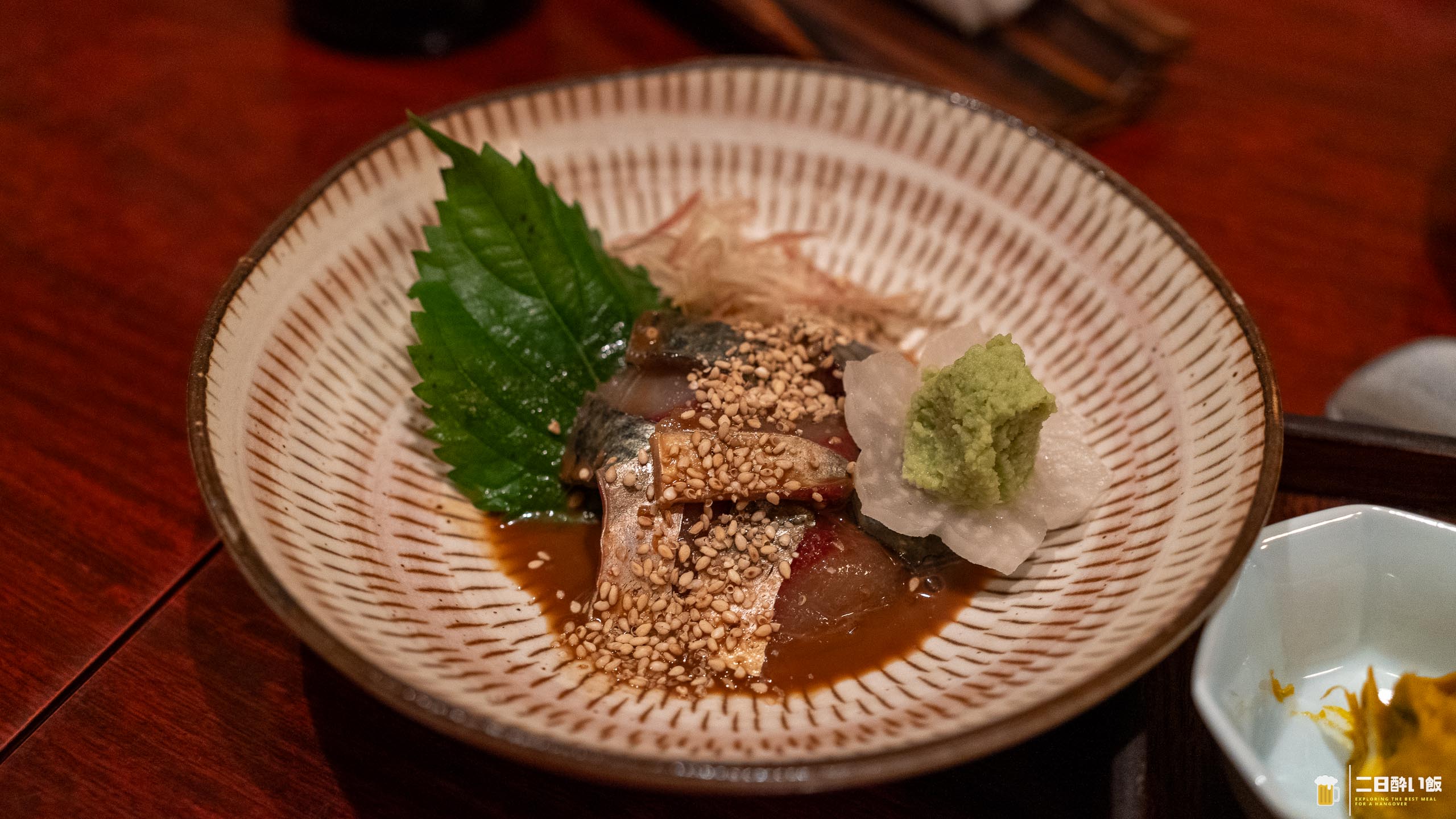 目の前に出された瞬間、まず驚くのは艶めくサバの美しさ。透き通るような身の奥にうっすらと脂が光り、香ばしいすり胡麻がたっぷりまとわりついている。箸でそっと持ち上げると、身がほぐれるように柔らかい。