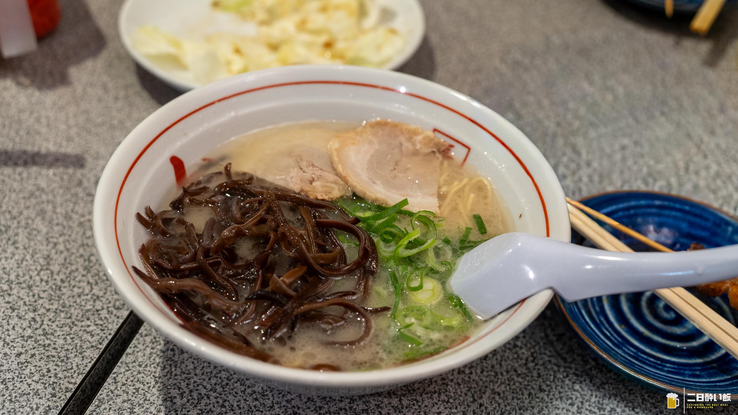 主役のきくらげは驚くほどシャキシャキ。スープを吸いながらも食感を失わず、噛むたびに心地よい音が鳴る。麺は極細のストレートで、博多らしいパツンと歯切れの良さ。チャーシューは薄切りながらも旨みが濃く、スープのまろやかさに塩味でアクセントを加えてくれる。卓上の紅生姜と胡麻を少し足すと、味の輪郭がさらに引き締まり、まるで別の一杯に変わるのも楽しい。