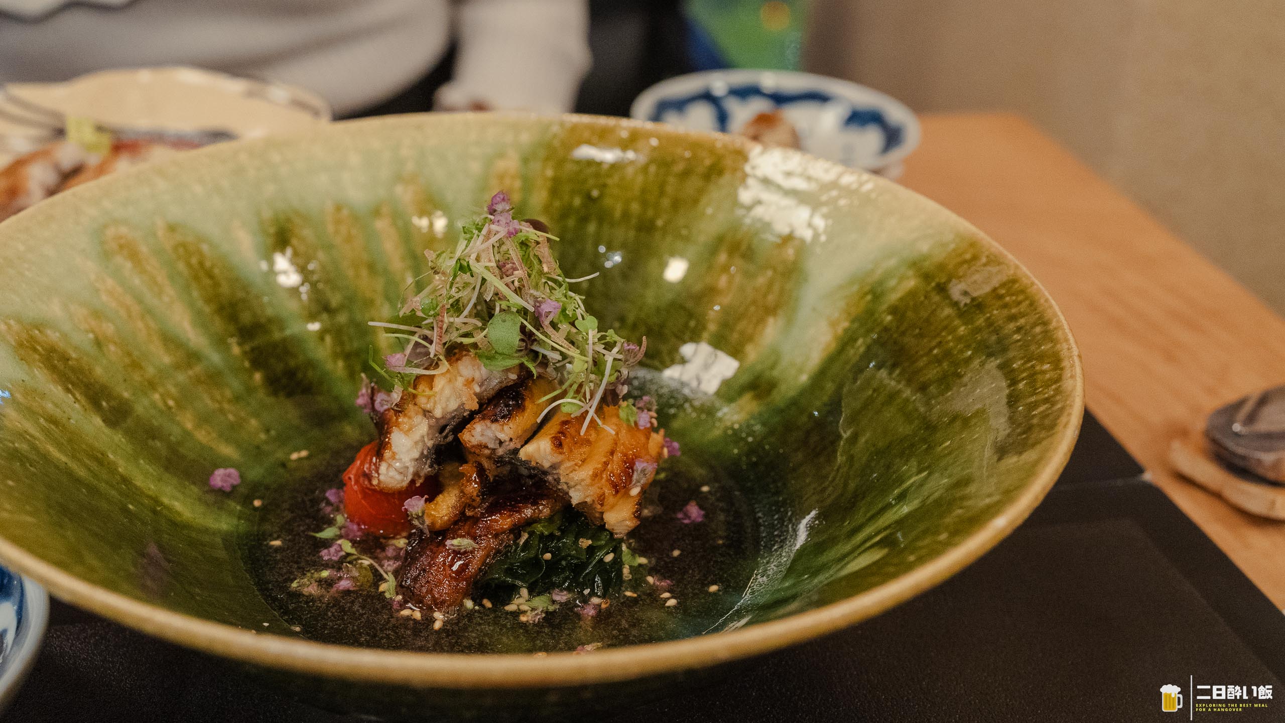 こちらも別で注文したうざく。きれいな盛り付けです!トマトやわかめ、きゅうり、花穂や薬味が上からちょこんと。鰻の脂と酢のキレが真正面からぶつかる料理ですが、高橋屋の一皿はそのバランス感覚が抜群です。香ばしく焼かれた鰻は、表面にほどよく脂を残しつつ中はふっくら。そこにシャキッとしたきゅうりと、角の立ちすぎないまろやかな酢が合わさります。口に入れた瞬間、まず酢の爽やかさが広がり、遅れて鰻のコクと旨味がじわっと追いかけてくる構成。脂はしっかりあるのに重たさはなく、鰻の香ばしさと酢の清涼感を感じるおつまみ。なんかこんなにちゃんとしたうざく初めてかもしれない。
