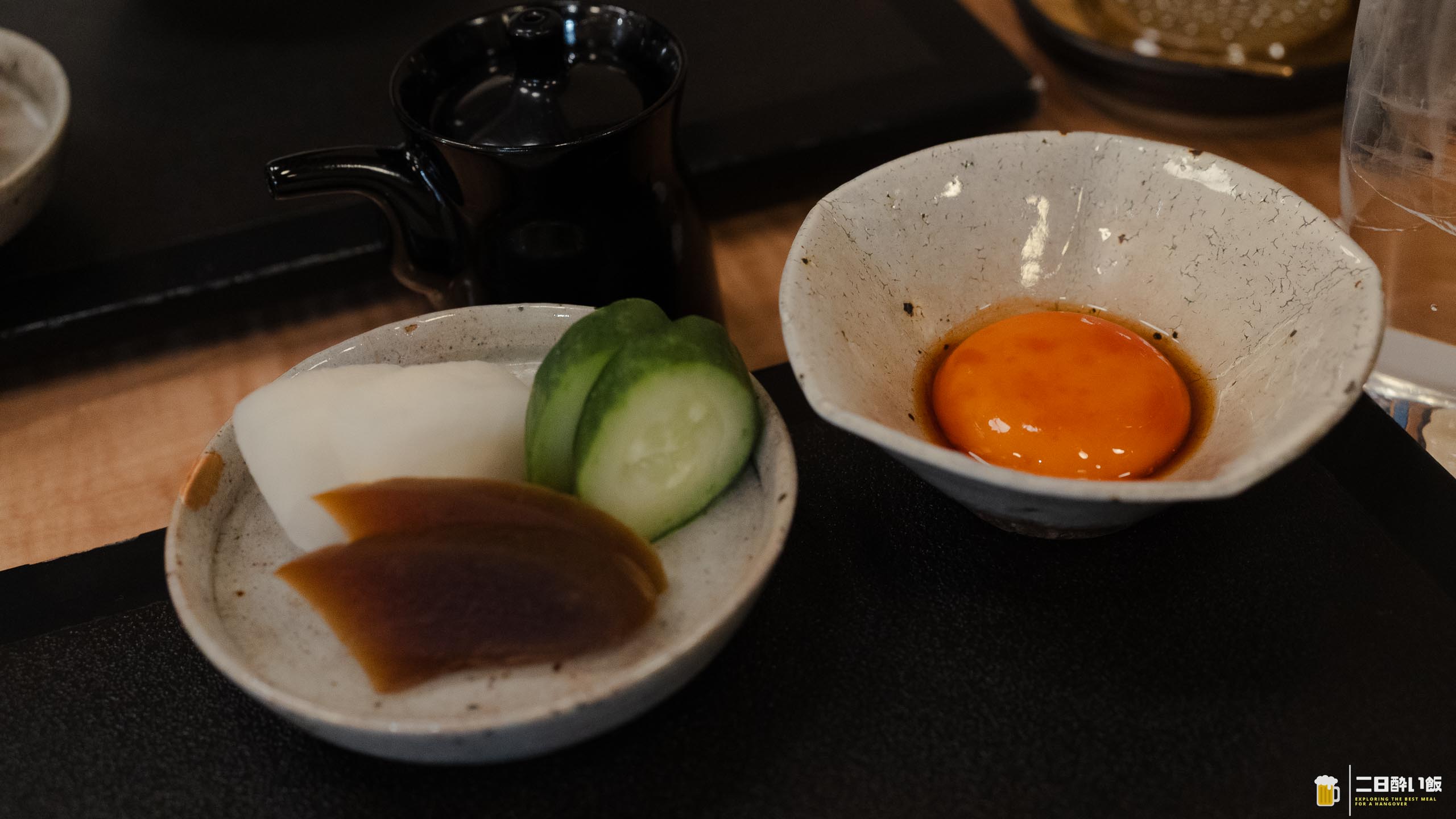 まずはお新香と卵黄。うなぎのタレにつけた卵黄だそうで、途中でうなぎをくぐらせて食べてみるのがよいですよ!とのこと。へぇー!こんな食べ方始めてみたかもしれない。珍しい!けど、絶対美味しいよなw
