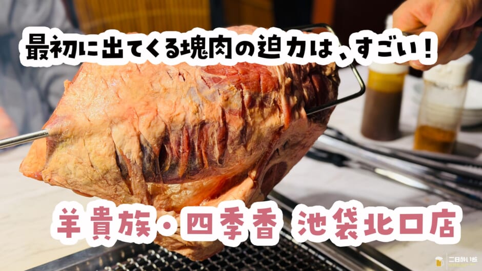 今日も美味しい物が食べたい!二日酔い飯です!さて、今日はガチ中華系でおもしろいところを探していたら、羊の塊肉の丸焼きみたいなのがドーン!と載っているおもしろそうなお店を池袋で見つけたので、そちらに行ってきました。予約してその場所に向かってみると!四季香の隣じゃないですか!なるほど、確かに全然気付かなかったけど「羊貴族・四季香 池袋北口店」お店の名前に四季香入ってるやん。あのガチ中華、四季香の羊メインのお店ってことですね。支店にしたってすぐ隣にあるとはwこれ、勘違いしちゃうひとも多そうだ。