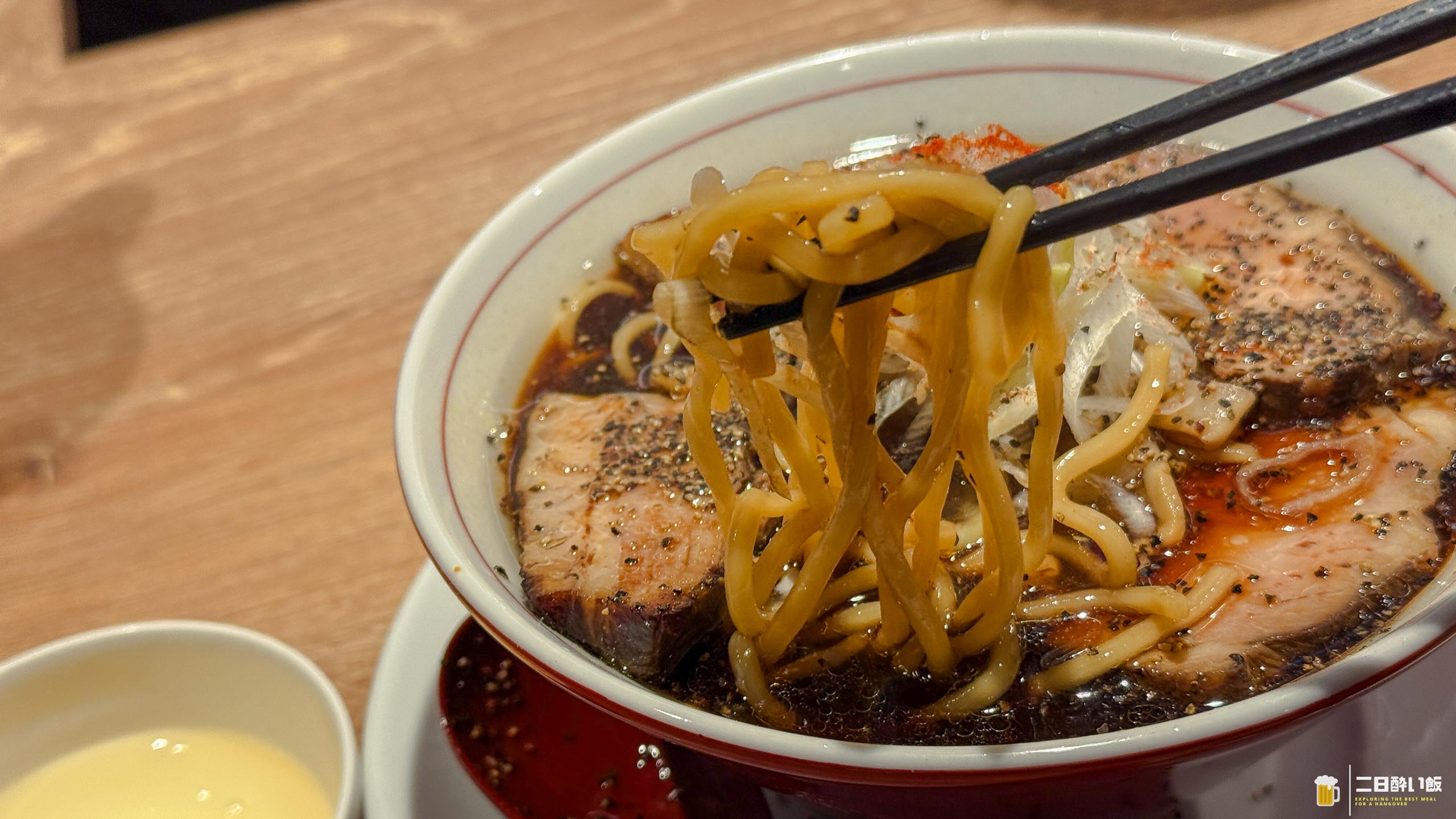 早速スープから頂きます。黒醤油ベースが引き締まっていて、見るからに濃いんですが、飲んでみるとキレがあって飲みやすい。醤油の香ばしい焦げ感とその裏の旨みの層が厚い。スープに関して、胡椒は思ったよりも軽く効いている感じで、“ただ黒い胡椒だけ”ではないですね!うまい。