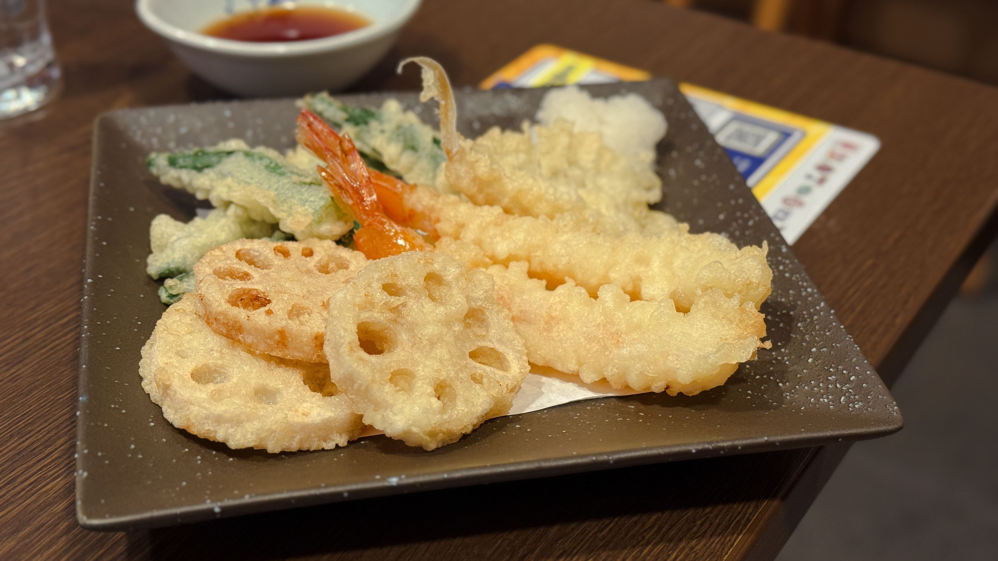 上海老天2個に、いとより天、おくら天にれんこん天。好きなものを組み合わせて頼めるのも嬉しい!