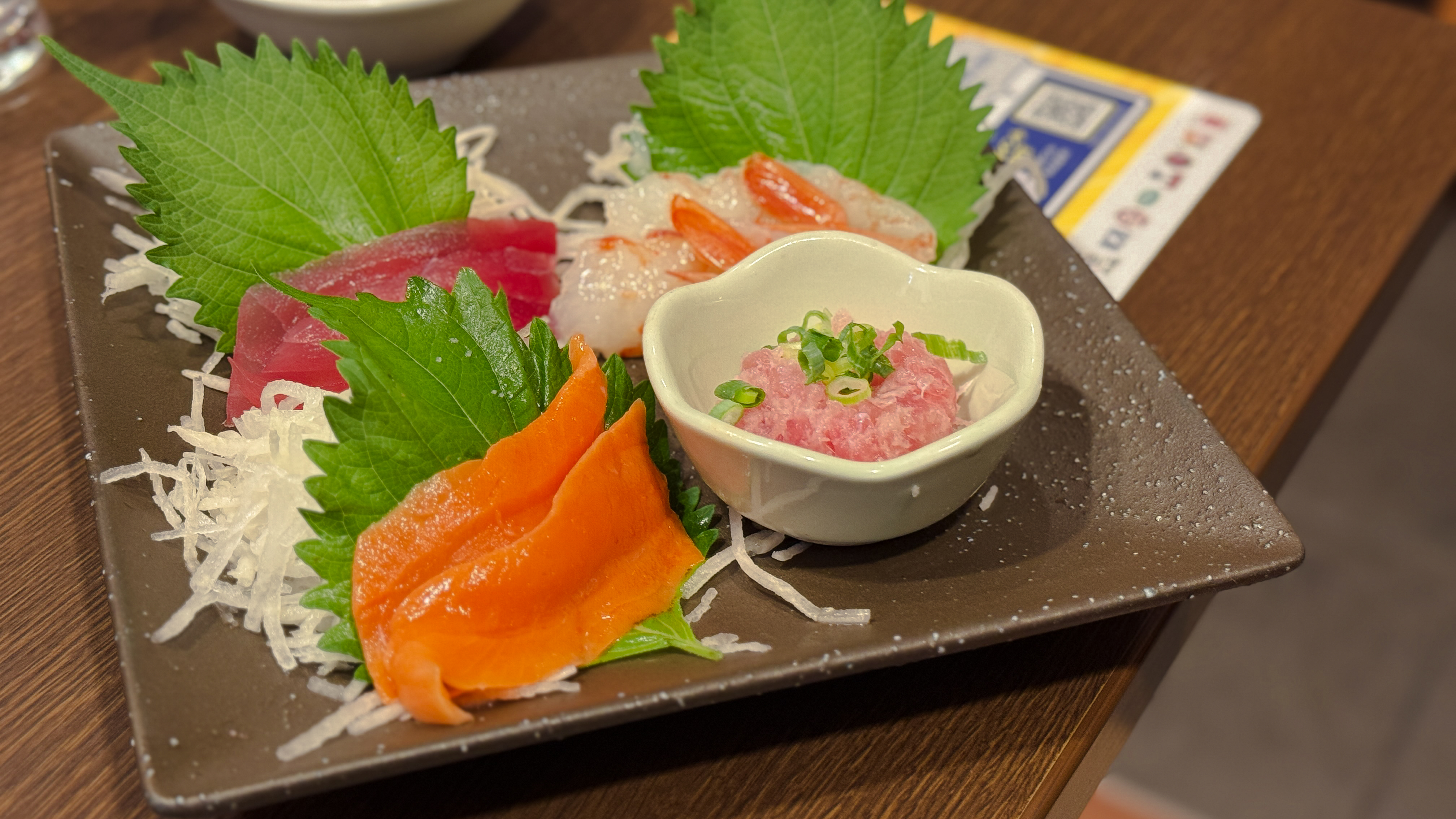 三人前は多いかな?と思って二人前に。これで880円。まぁ、これはスーパーとかみると普通か、ちょい高いかくらいかしら。でも、サーモンが瑞々しくてお刺身はどれも美味しかった!ちょこんとねぎとろ付いてくれているのも嬉しいし、これも満足。天ぷら、刺し身と満足感高い!そして飲み物は翠ジンのすだちいりソーダ。