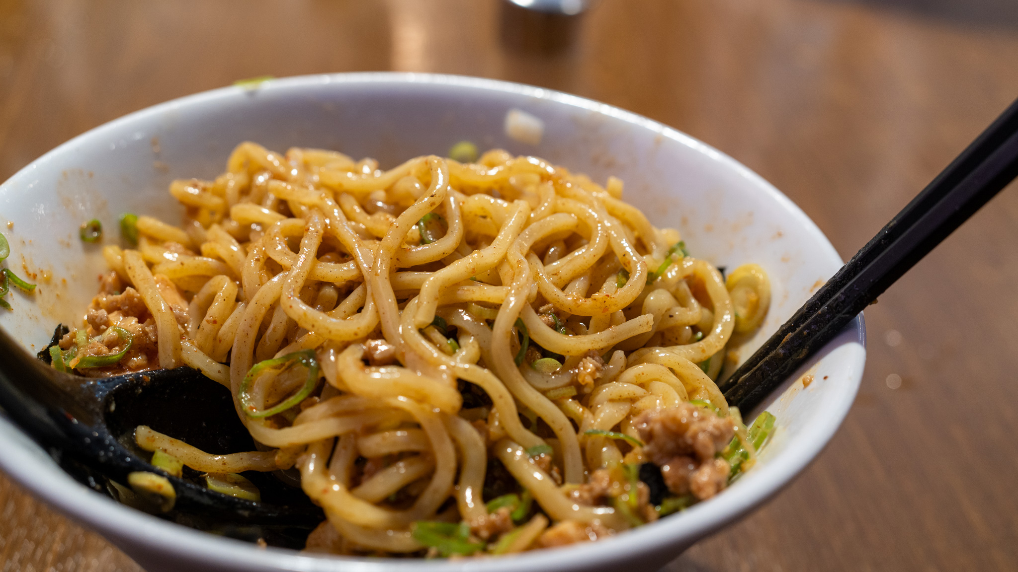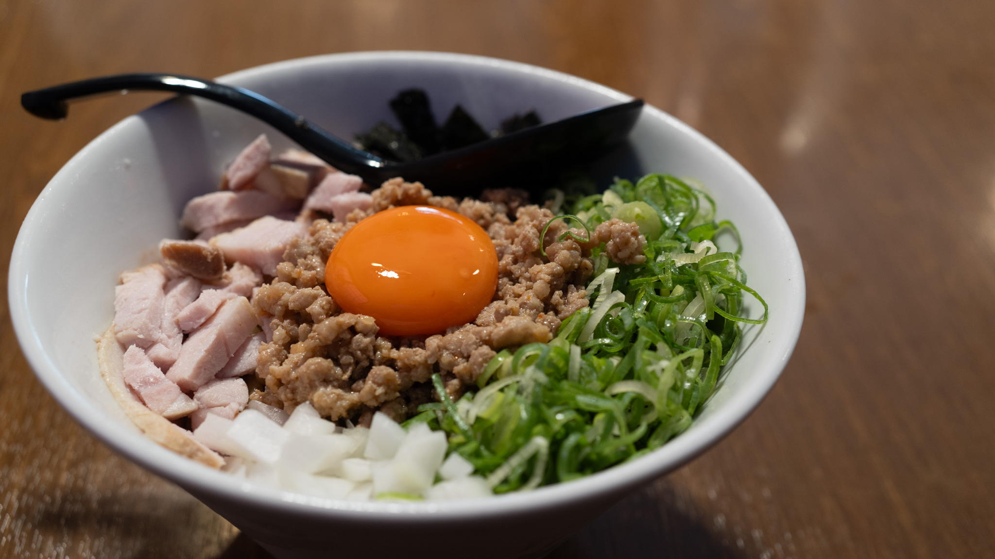 にしても、具材がきれいに並んでいてよいですね!ネギと、チャーシュー、肉みそに海苔、生の玉ねぎ。中央にきれいな色の卵が載っています。混ぜるのがもったいないけど混ぜちゃいます。