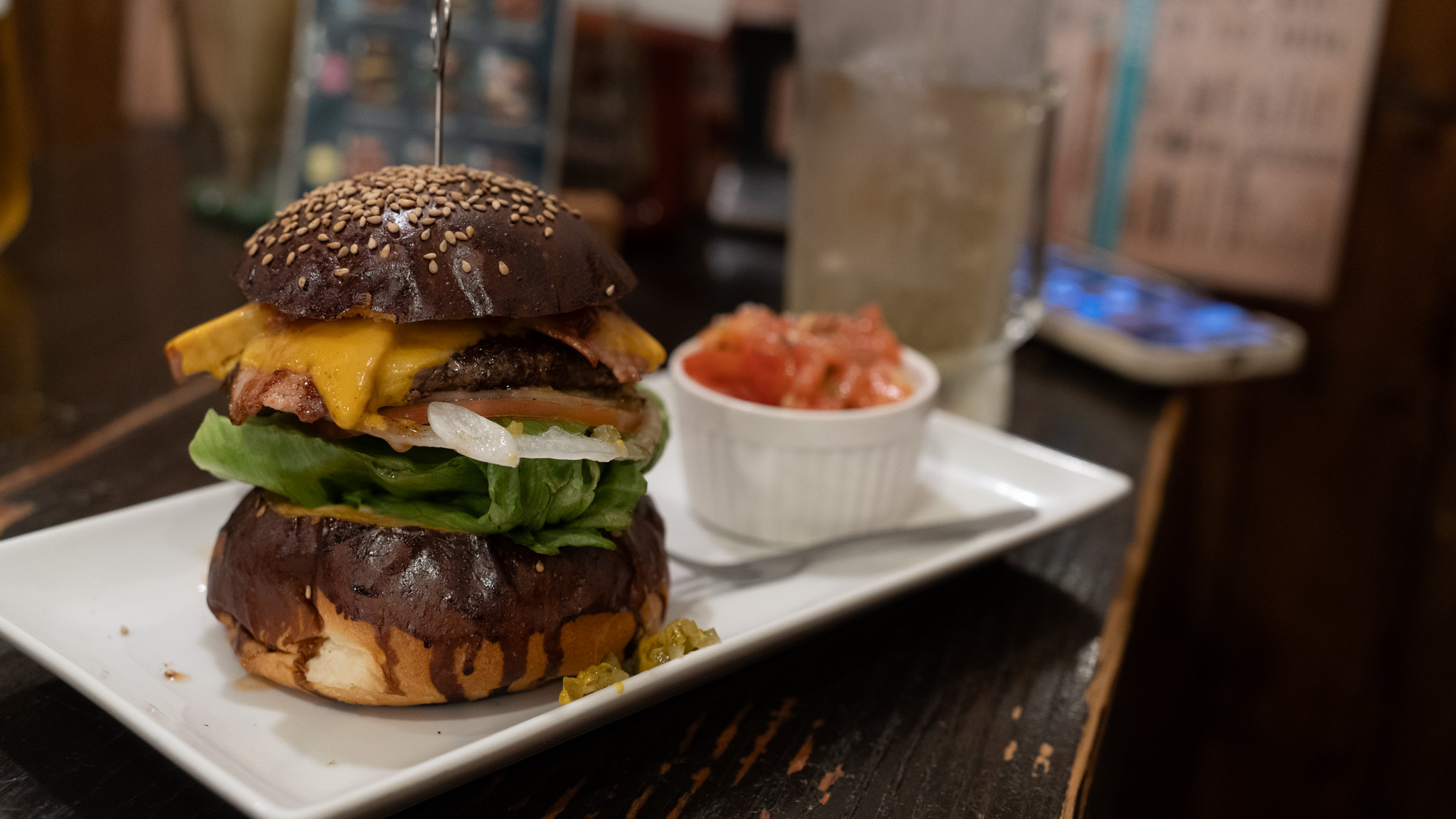 相変わらずめっちゃ見栄えの良いバーガーですね!レタスはシャキッとしていて、その上に肉肉しいパティと、たっぷりのチーズ、ベーコンが乗っかっています。バンズが分厚くて、少し黒いのですが、カラメルを塗って焼き上げたからだそうで。甘みと香ばしさを感じて中の具材との相性も抜群。とってもジューシーなパティに全然負けてないですね。中に入っている、「ヘブンソース」は、玉ねぎの繊維感を感じるやや甘めの自家製ソース。うまい。