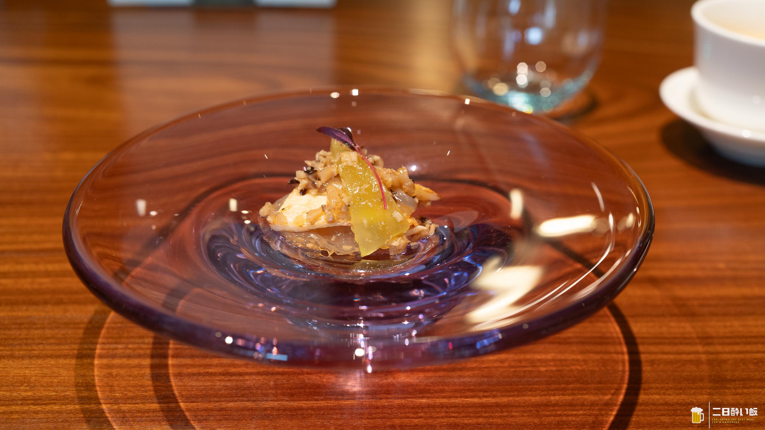最初に出てきたのはクラゲとマコモダケ。ソースは数種類のキノコの醤。一口食べてみると、めっちゃおいしい。