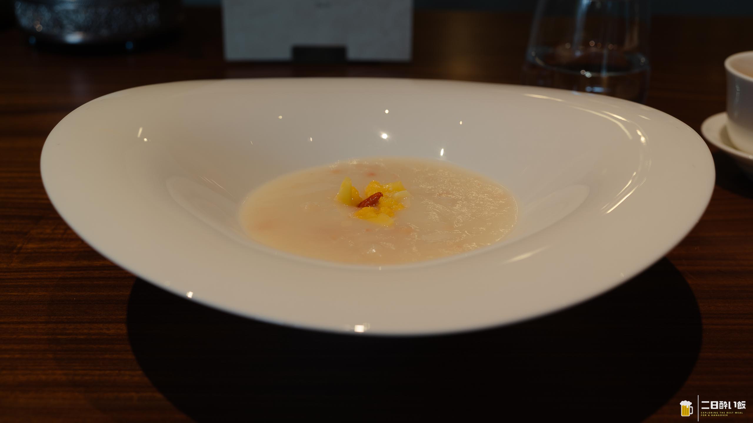 。一口すすると、まずカリフラワーの柔らかな甘みがふわっと広がり、滑らかな質感が口当たりの良さを際立たせます。ズワイ蟹の風味は決して主張しすぎず、蟹の旨味がぽってりと溶け込んだクリームと一体になって、上品なコクを生み出しています。香りの深さがすごい。で、付け合わせに載っている黄色いのはイエローカリフラワー。スープの中ではごろっとフカヒレが静かに存在感を放っています。フカヒレ自体はしっかりとした繊維感を残しつつ、うま味豊かなスープに馴染んでいて、噛むごとにホッとするスープ!最強のスープ!