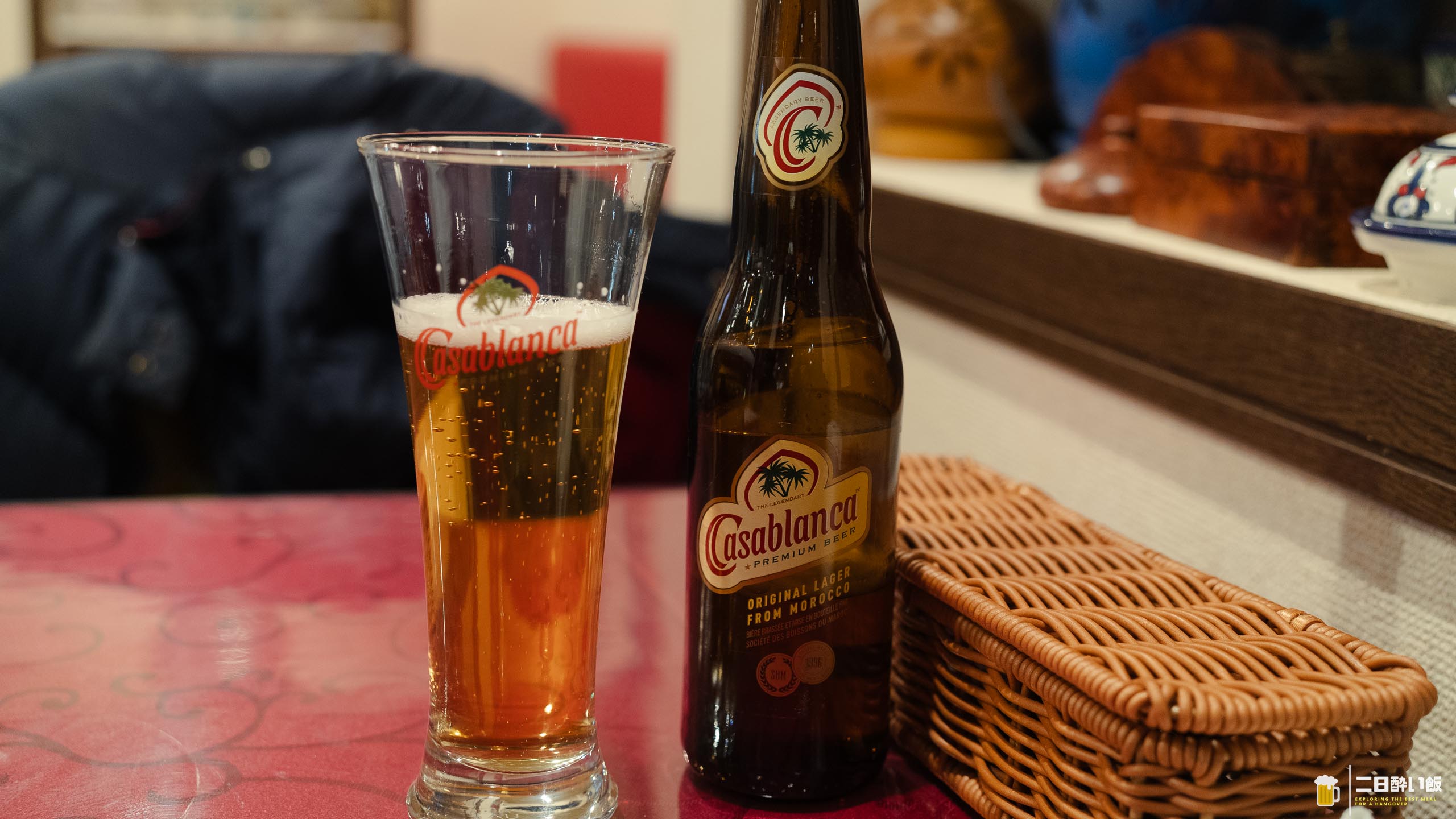 最初の一杯は、モロッコの精神を感じる!と外看板に書いてあったモロッカンビール。「カサブランカ」。