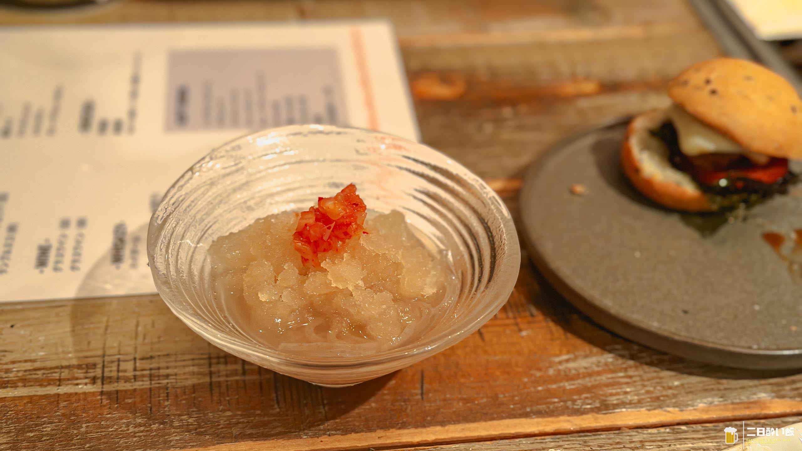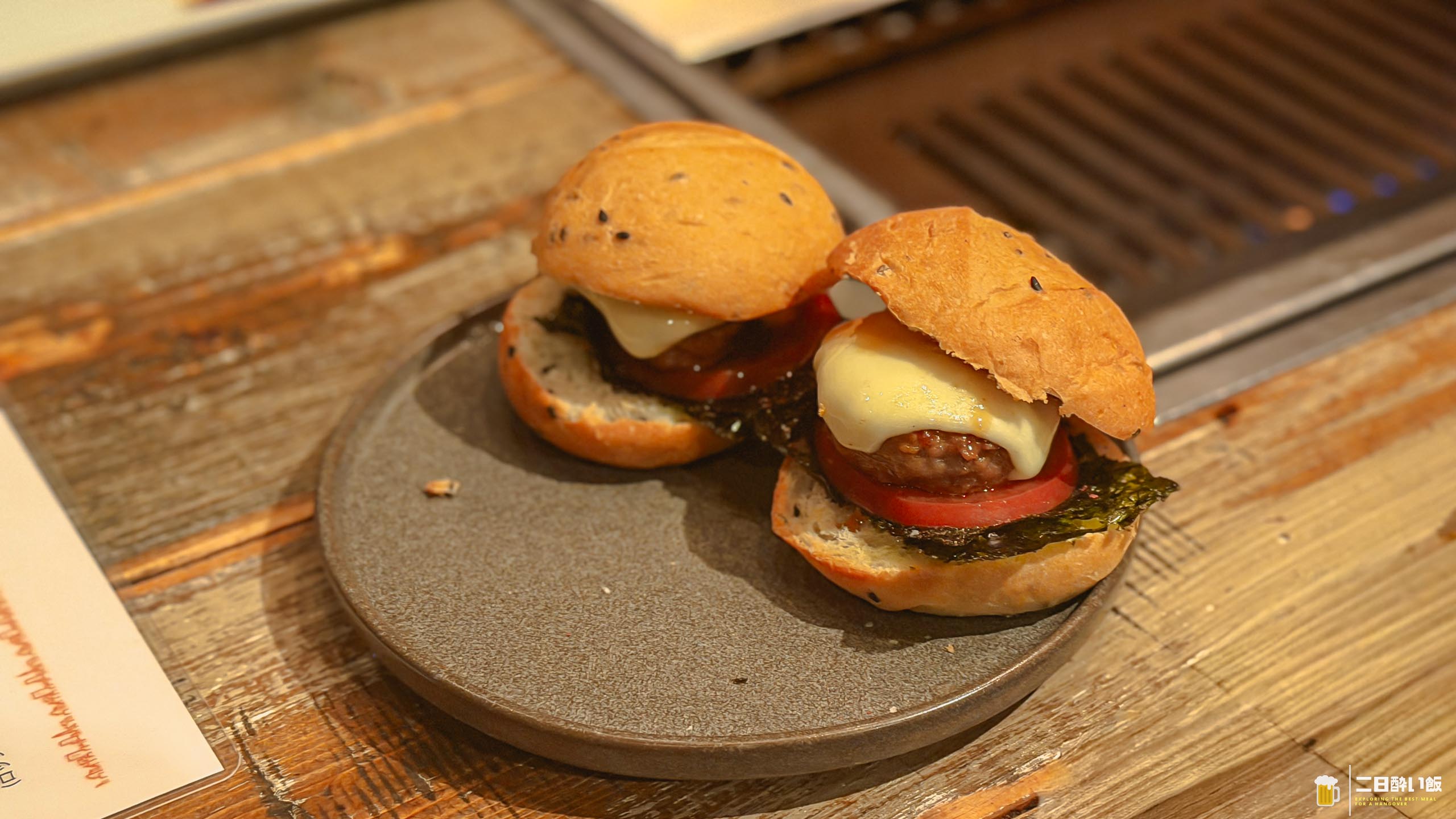 kintaでこのメニュー食べたことないかも。一口サイズのバーガーでかぶりついてみると、トリュフのいい香り。チーズも濃厚で、和牛のしっかりしたパティにも全然負けない。韓国海苔が入っているのもユニークですね!