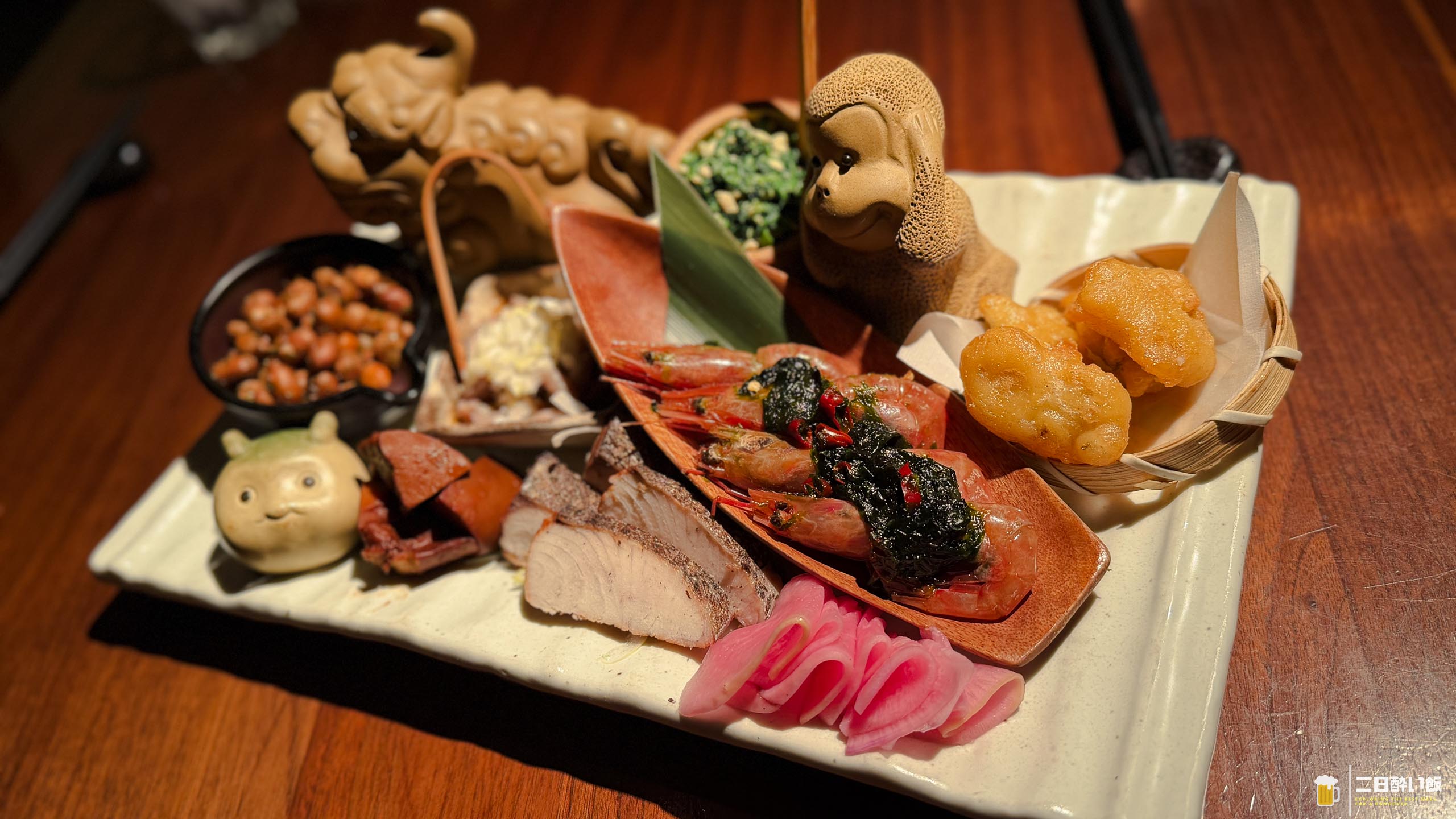 エビの紹興酒漬けにフリット、ピーナツによだれ鶏、お魚、大根、白和えなどなど。こちらの大皿で4人分になります。甘エビの紹興酒漬けがおいしいのよね!