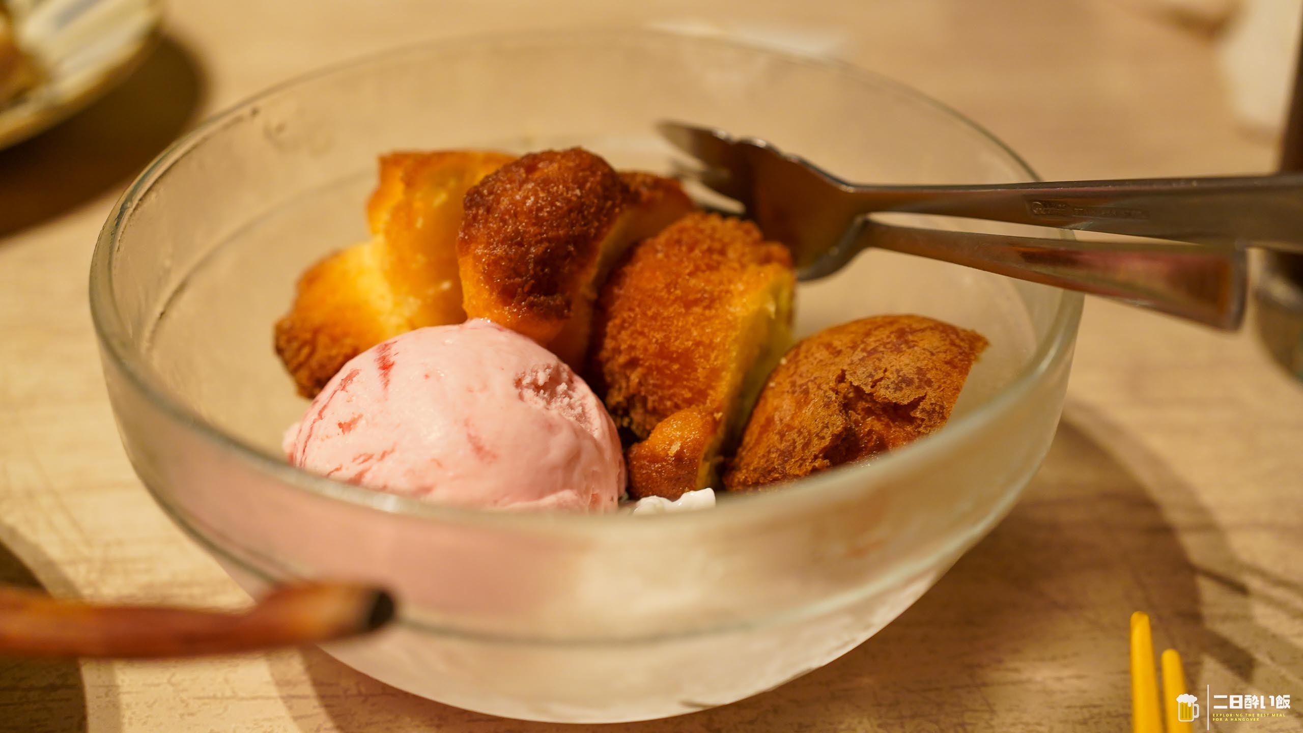 アイスにサーターアンダギーを添えたもの。アイスが少し溶けてサーターアンダギーに絡んだときが一番美味しい!