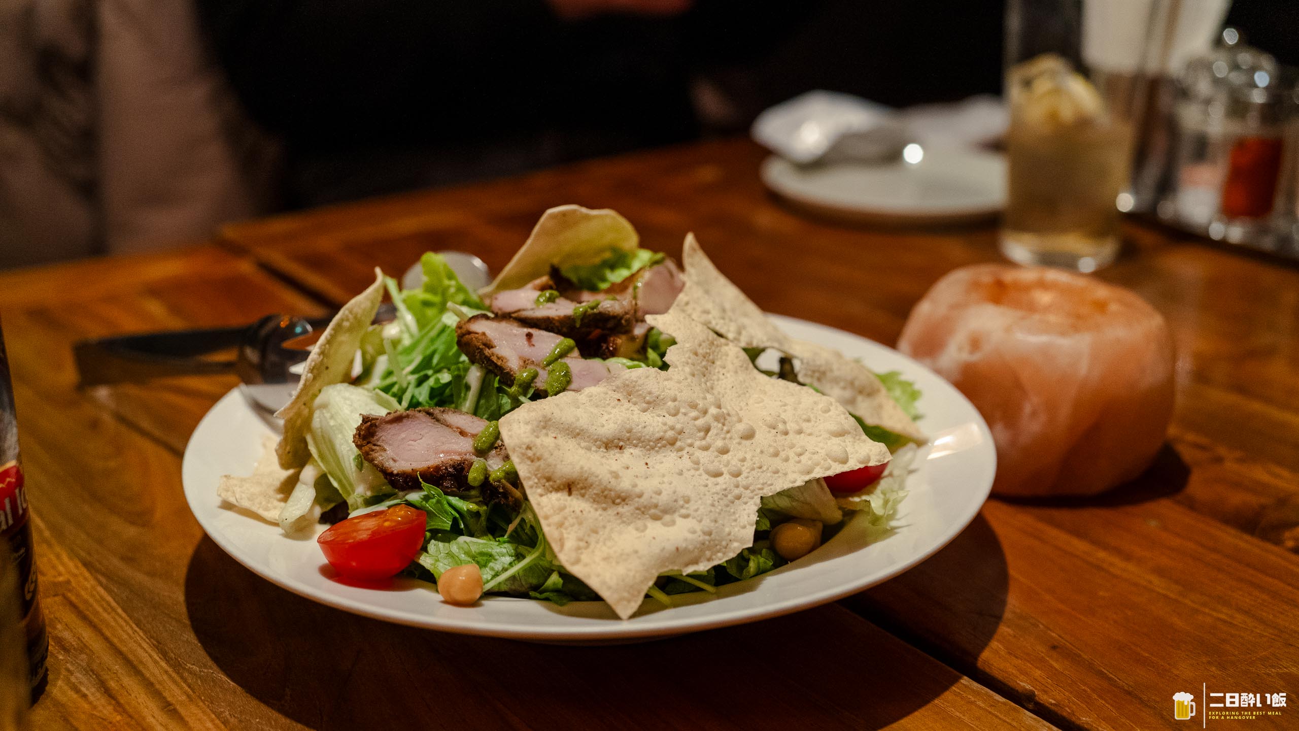 グリーンサラダの上にスパイスを効かせてグリルしたチキン。で、上にはパパドという豆を薄焼きにしてパリパリにしたやつ。たまーにインドカレー屋いくと、付いてくることありますよね。
