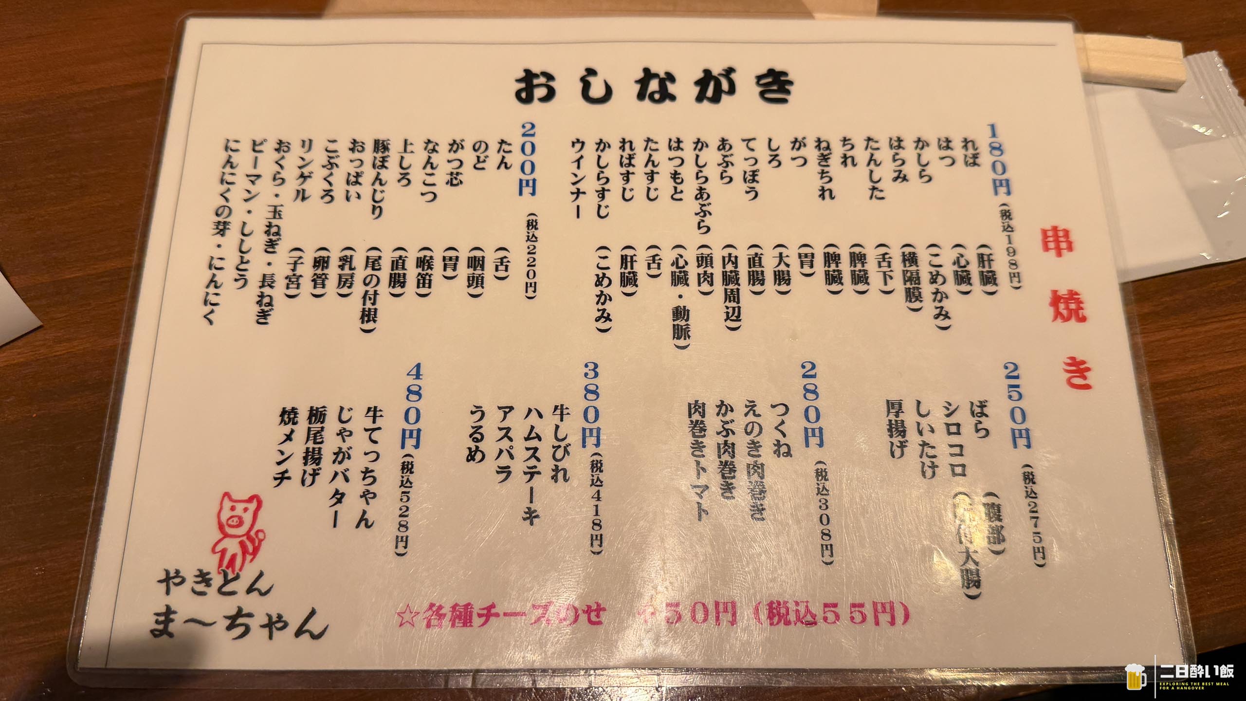 やきとん、いろんな部位があります。串焼きは180円〜480円まで。栃尾の揚げ串なんかもあるんですね。ちょっと気にはなる。裏をめくるとおつまみも沢山!もつ刺しなんかもあるみたいです。ちょろっと寄るくらいだと思っていたけどこれだけメニューが多いと腰を据えてのみたくなる気持ちもわかる。飲み物もビール、キンミヤ、酎ハイ、ウィスキー。割り物にコーヒー、コーヒー牛乳という文字を!最初「え?」と思ったけど、まぁ、合わないことはない気もするけど珍しい。