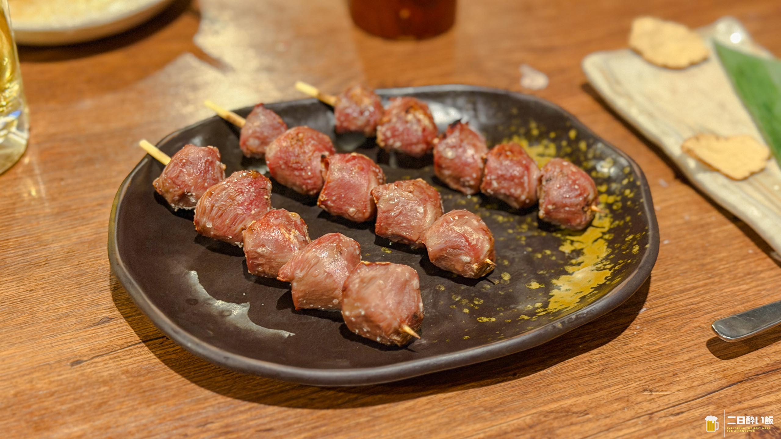 さ、これが究極のレバー串。本当の名前は賞味期限180秒 究極の鶏レバー”ネギ塩”串なんですねwこちら、提供と同時に砂時計がスタート。180秒以内に食べてね!ってなわけで、写真撮って、付け合せの鰹節をかけて!